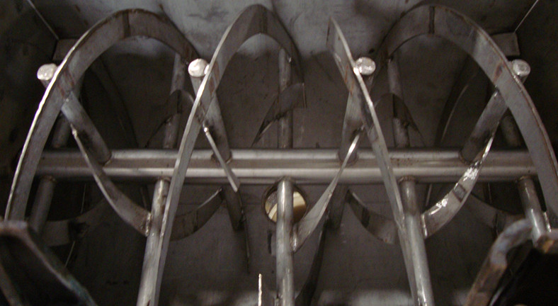 臥式螺帶混合機由安裝于攪拌軸上的內外徑螺旋帶動桶體內物料翻動,使攪拌器在桶體內大范圍翻動物料。攪拌器結構上,螺旋設計成內外、左右互為反螺旋,攪拌器工作時內螺旋帶動靠近軸心處物料做軸心旋轉,軸向由內至兩側推動,外螺旋帶動靠近筒壁物料做軸心旋轉,軸向由兩側至內推動,于是造成物料在筒體內對流循環(huán)、剪切滲混,完成物料在較短時間內快速均勻混合。