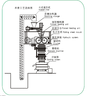 粉狀物料由振動(dòng)給料斗經(jīng)橫向螺旋送料器定量,均勻地加人軋片主料斗,使軋片主料斗內(nèi)保持恒定的料粒,然后由軋片主料內(nèi)的縱向錐螺旋對(duì)粉料進(jìn)行預(yù)壓縮并輸送到兩只壓輥的弧形槽口,兩只壓輥表面均勻分布形狀相同的半扁圓形弧槽或菱形槽,通過(guò)一對(duì)齒輪的嚙合傳動(dòng),使兩只壓輥等速,反向旋轉(zhuǎn),將錐螺旋輸送至槽口的物料咬入槽內(nèi)并瞬間強(qiáng)制壓縮,物料經(jīng)過(guò)壓縮后隨著壓力逐漸減小在其彈力及重力作用下,從槽內(nèi)脫落,進(jìn)入破碎整粒系統(tǒng),然后根據(jù)用戶的粒度要求過(guò)篩、分級(jí),得到符合質(zhì)量要求的均勻顆粒狀產(chǎn)品,篩下粉重新返回振動(dòng)料斗循環(huán)利用。
