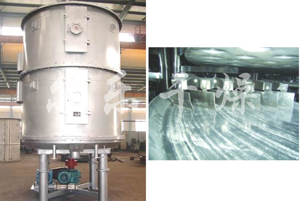 濕物料自加料器連續(xù)地加到干燥器上部一層干燥盤上,帶有耙葉的耙臂作回轉(zhuǎn)運(yùn)動(dòng)使耙臂作回轉(zhuǎn)運(yùn)動(dòng)使耙葉連續(xù)地翻抄物料。物料沿指數(shù)螺旋線流過(guò)干燥盤表面,在小干燥盤上的物料被移送到外緣,并在外緣落到下方的大干燥盤外緣,在大干盤上物料向里移動(dòng)并從中間落料口落如下一層小干燥盤中。大小干燥盤上下交替排列,物料得以連續(xù)地流過(guò)整個(gè)干燥器。中空的干燥盤內(nèi)通入加熱介質(zhì),加熱介質(zhì)形式有飽和蒸汽、熱水和導(dǎo)熱油,加熱介質(zhì)由干燥盤的一端進(jìn)入,從另一端導(dǎo)出。已干物料從后一層干燥盤落到殼體的底層,最后被耙葉移送到出料口排出。濕份從物料中逸出,由設(shè)在頂蓋上的排濕口排出,真空型盤式干燥器的濕氣由設(shè)在頂蓋上的真空泵口排出。從底層排出的干物料可直接包裝。通過(guò)配加翅片加熱器、溶劑回收冷凝器、袋式除塵器、干料返混機(jī)構(gòu)、引風(fēng)機(jī)等輔機(jī),可提高其干燥的生產(chǎn)能力,干燥膏糊狀和熱敏性物 料,可方便地回收溶劑,并能進(jìn)行熱解和反應(yīng)操作。