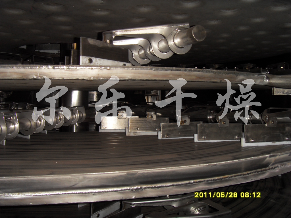 濕物料自加料器連續(xù)地加到干燥器上部一層干燥盤上,帶有耙葉的耙臂作回轉(zhuǎn)運(yùn)動(dòng)使耙臂作回轉(zhuǎn)運(yùn)動(dòng)使耙葉連續(xù)地翻抄物料。物料沿指數(shù)螺旋線流過(guò)干燥盤表面,在小干燥盤上的物料被移送到外緣,并在外緣落到下方的大干燥盤外緣,在大干盤上物料向里移動(dòng)并從中間落料口落如下一層小干燥盤中。大小干燥盤上下交替排列,物料得以連續(xù)地流過(guò)整個(gè)干燥器。中空的干燥盤內(nèi)通入加熱介質(zhì),加熱介質(zhì)形式有飽和蒸汽、熱水和導(dǎo)熱油,加熱介質(zhì)由干燥盤的一端進(jìn)入,從另一端導(dǎo)出。已干物料從后一層干燥盤落到殼體的底層,最后被耙葉移送到出料口排出。濕份從物料中逸出,由設(shè)在頂蓋上的排濕口排出,真空型盤式干燥器的濕氣由設(shè)在頂蓋上的真空泵口排出。從底層排出的干物料可直接包裝。通過(guò)配加翅片加熱器、溶劑回收冷凝器、袋式除塵器、干料返混機(jī)構(gòu)、引風(fēng)機(jī)等輔機(jī),可提高其干燥的生產(chǎn)能力,干燥膏糊狀和熱敏性物 料,可方便地回收溶劑,并能進(jìn)行熱解和反應(yīng)操作。